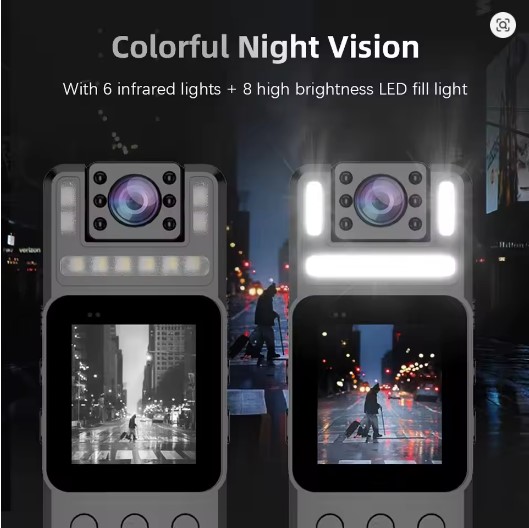 【Night Vision & Warning Lights】With 6 infrared lights, the body camera supports night vision function. You can record high definition videos even at night. The body camera also has warning lights that can be activated when the camera is off, and supports 5 lighting modes: steady white light, steady red light, red light flashing, red and white light alternately flashing, rapid flashing of the two upper red and blue lights.